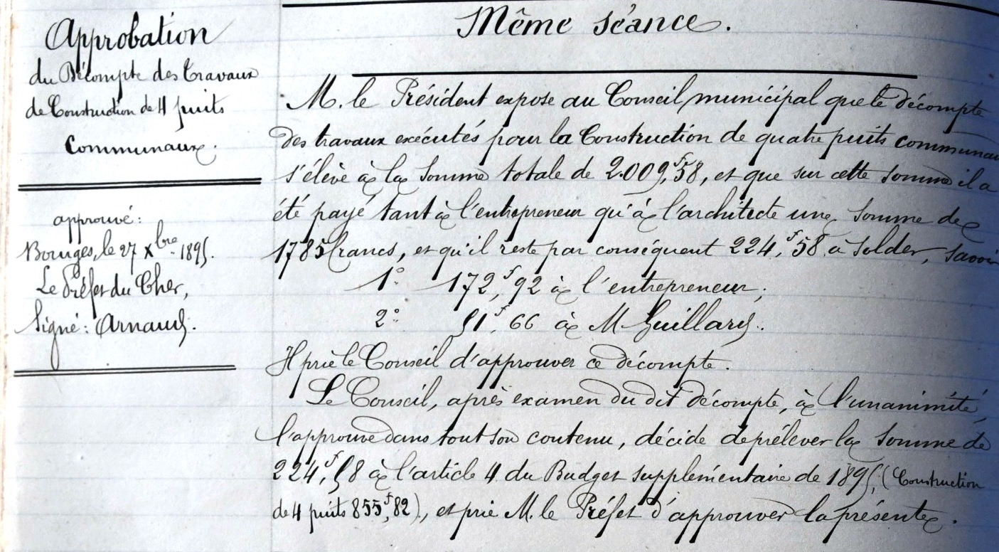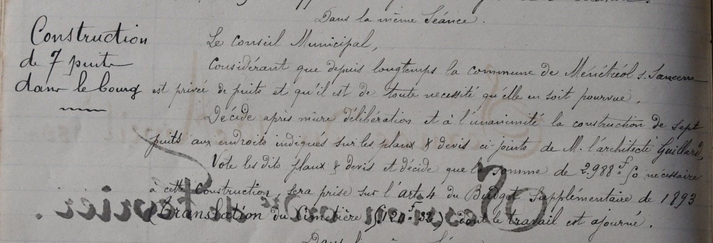 « le Conseil Municipal, Considérant que depuis longtemps la commune de Ménétréol s. Sancerre est privée de puits et qu’il est de toute nécessité qu’elle en soit pourvue, Décide après mûre délibération et à l’unanimité la construction de sept puits aux endroits indiqués sur les plans et devis de Mr l’architecte Gaillard Vote les dits plans et devis et décide que la somme de 2988 fr, somme nécessaire à cette construction sera prise sur l’article 4 du budget supplémentaire de 1893 »