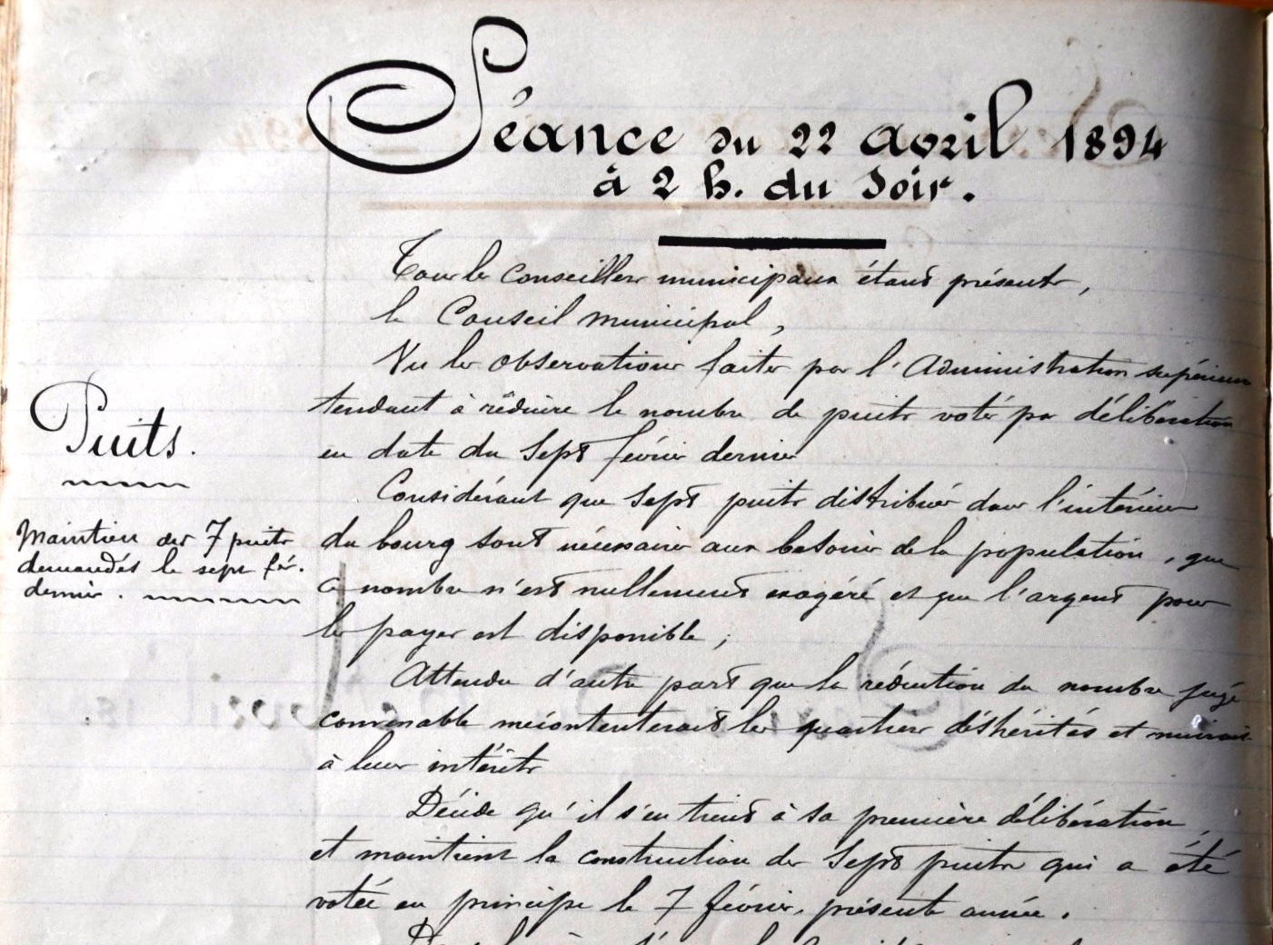 « vu les observations faites par l’administration supérieure tendant à réduire le nombre de puits votés par délibération en date du sept février dernier considérant que sept puits distribués dans l’intérieur du bourg sont nécessaires aux besoins de la population, que ce nombre n’est nullement exagéré et que l’argent pour payer est disponible... décide de s’en tenir à sa première délibération et maintient la constriction de sept puits… »