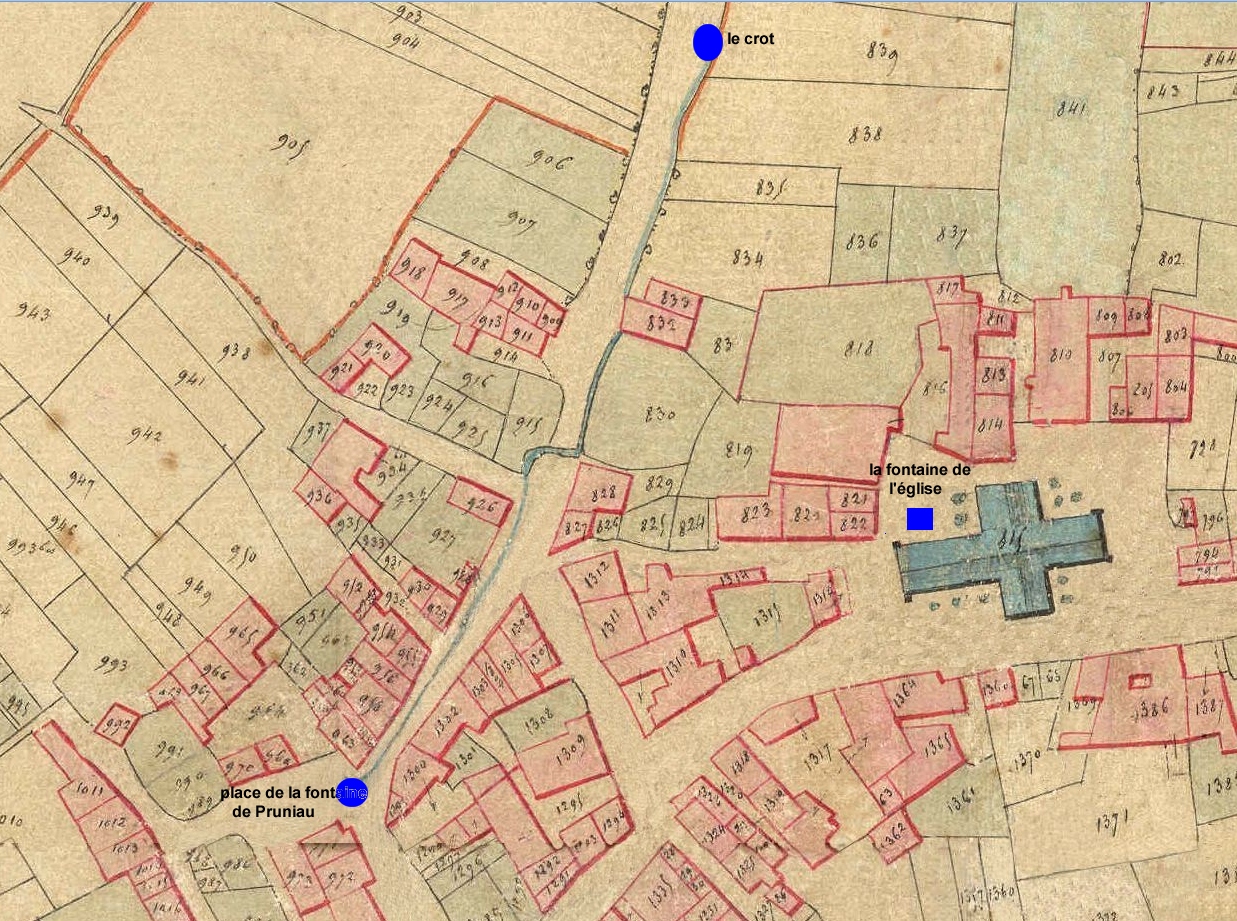 l’eau de la fontaine de« prugneau » (pruneau ou pruniau suivant les documents, c'est évidement une transcription de l'oral...) coule librement tout le long de la route jusqu’au crot où sera installé bien plus tard le lavoir. On voit aussi l’emplacement de la fontaine de la cour de l’église qui est, elle, couverte.