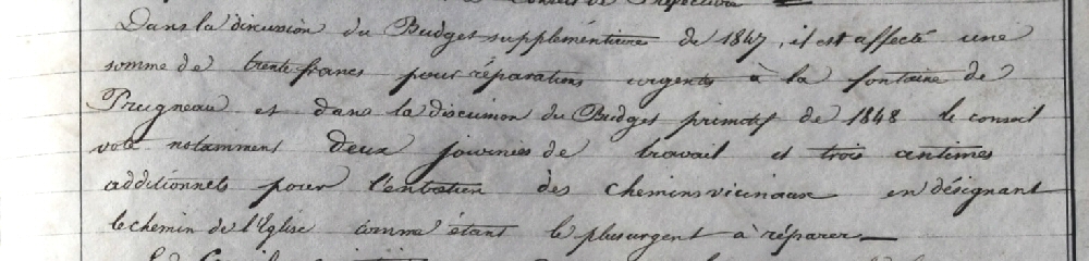« dans la discussion du budget supplémentaire de 1847, il est affecté une somme de 30 francs pour réparations urgentes à la fontaine de Prugneau »