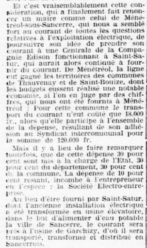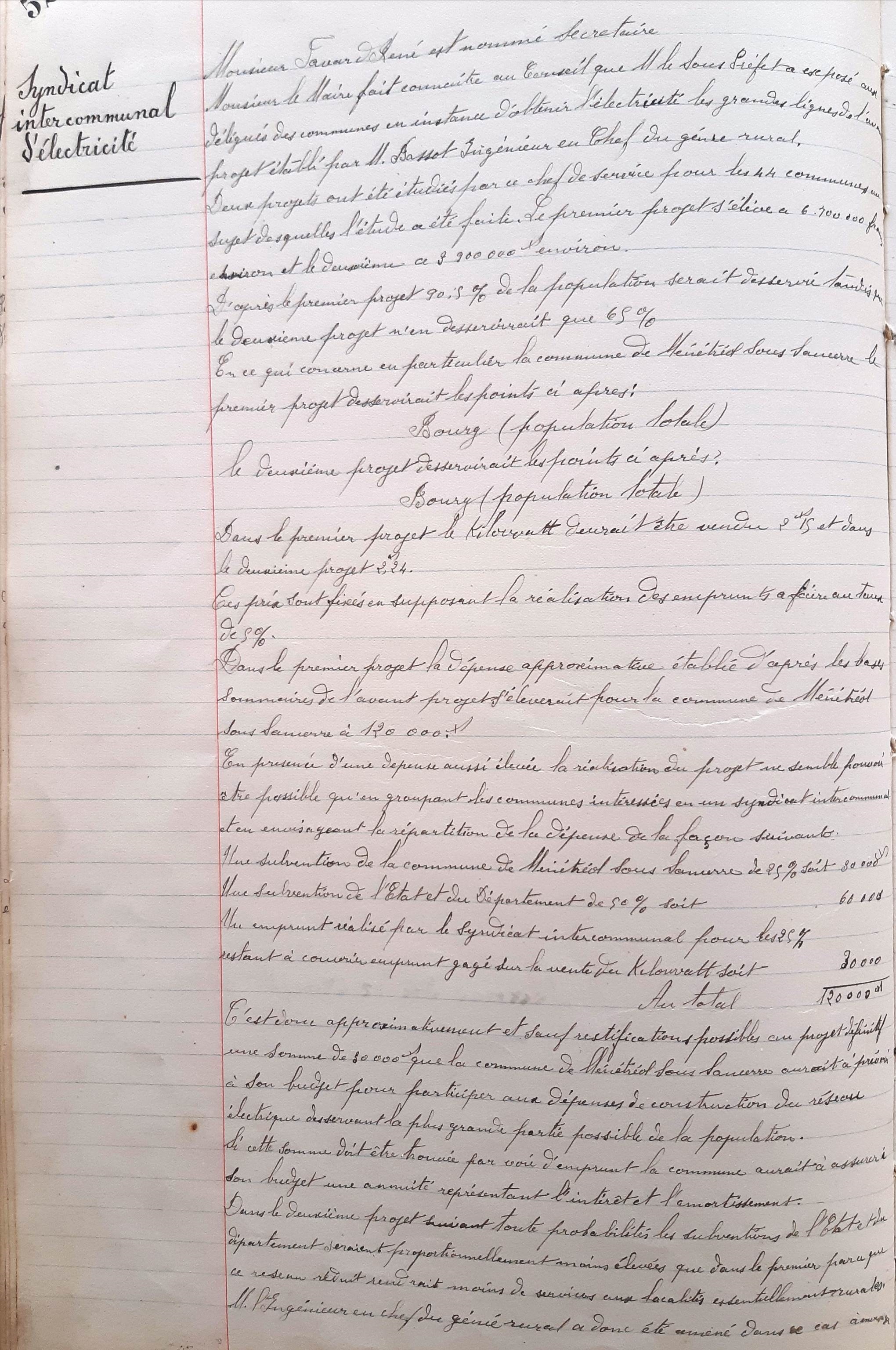 "Mr le Maire fait connaître au conseil que Mr le sous Préfet a exposé aux délégués des communes en instance d'obtenir l'électricité les grandes lignes de l'avant-projet établi par Mr Bassot, ingénieur en chef du Génie Rural. Deux projets ont été étudiés par ce chef de service pour les 44 communes au sujet desquelles l'étude a été faite. Le premier projet séleve à 6 700 000 francs nviron et le deuxième à 3 900 000 francs environ. D'après le premier projet 90.5%de la population serait desservie tandis que le deuxième projet n'en desservirait que 65% En ce qui concerne en particulier la commune de Ménétréol sous Sancerre le premier projet desservirait les points ci-après: Bourg (population totale) ..... Dans le premier projet le kilowatt devrait être vendu 2.15fr et dans le deuxième projet 2.24fr ... Dans le premier projet la dépense approximative établie d'après les bases sommaires de l'avant-projet s'élèverait pour la commune de Ménétréol sous Sancerre à 120 000fr. En présence d'une dépense aussi élevée la réalisation du projet ne semble pouvoir être possible qu'en groupant les communes intéressées en un syndicat intercommunal et n envisageant la répartition de la dépense de la façon suivante: - une subvention de la commune de Ménétréol de 25% soit 30 00fr - une subvention de l'Etat et du Département de 50% soit 60 000fr - un emprunt réalisé par le syndicat intercommunal pour les 25% restant à couvrir emprunt gagé sur la vente du kilowatt soit 30 000fr total 120 000fr. ... Le Conseil muicipal après en avoir délibéré, décide: - 1° qu'il y a lieu de constituer avec les 43 communes pour lesquelles le service du Génie Rural a étudié un projet d'électrification des campagnes en syndicat intercommunal conformement aux dispositions de la loi du 5 avril 1884 complétée par les lois du 22 mars 1890 et du 18 novembre 1917 réglementant la matière. Ce syndicat aura pour but de réaliser la construction d'un réseau électrique établi dans l'esprit de l'avant-projet dressé par Mr l'Ingénieur en chef du Génie rural et desservant environ 80 à 90% de la population..." ... conseil municipal du 2 mai 1923 |