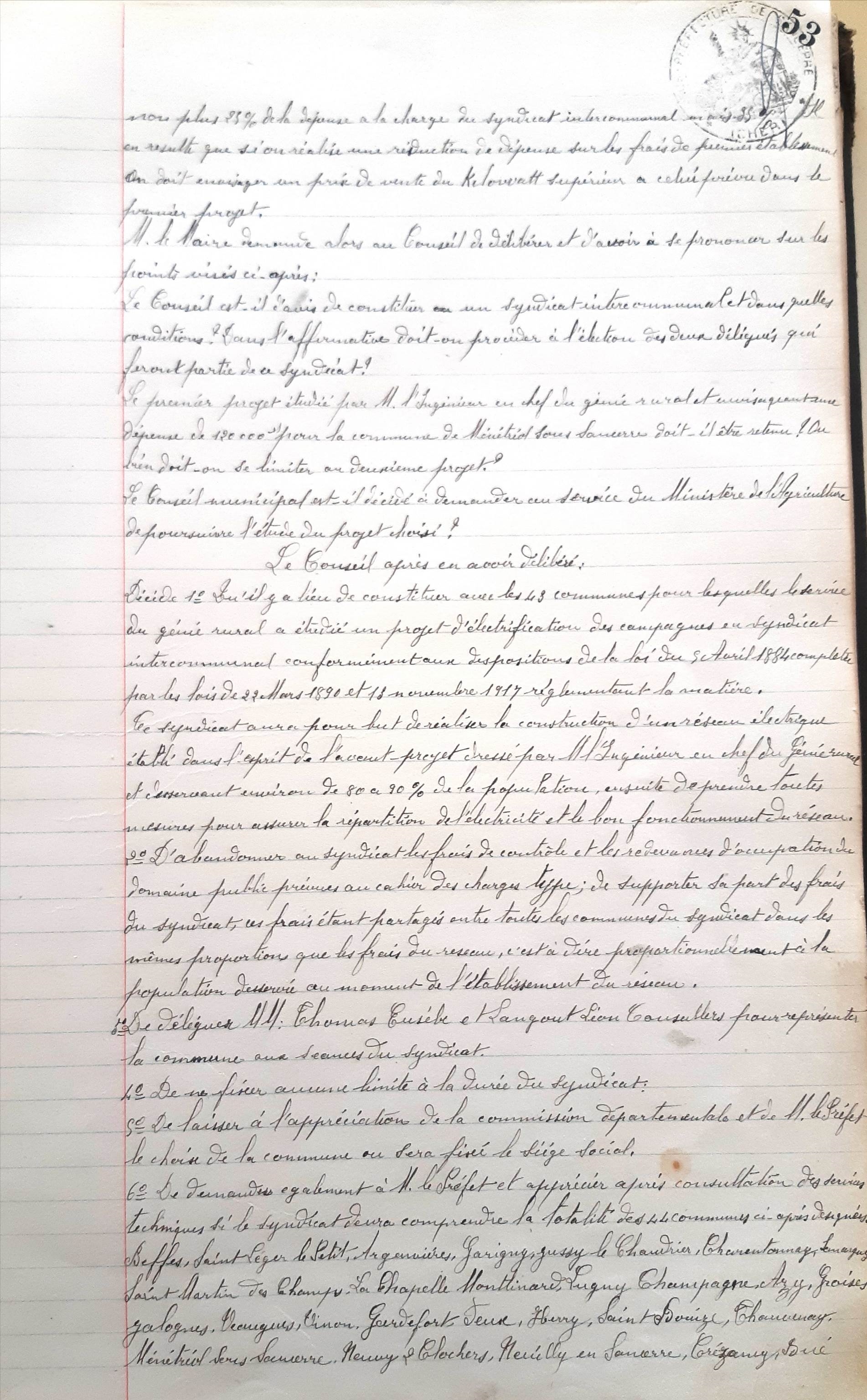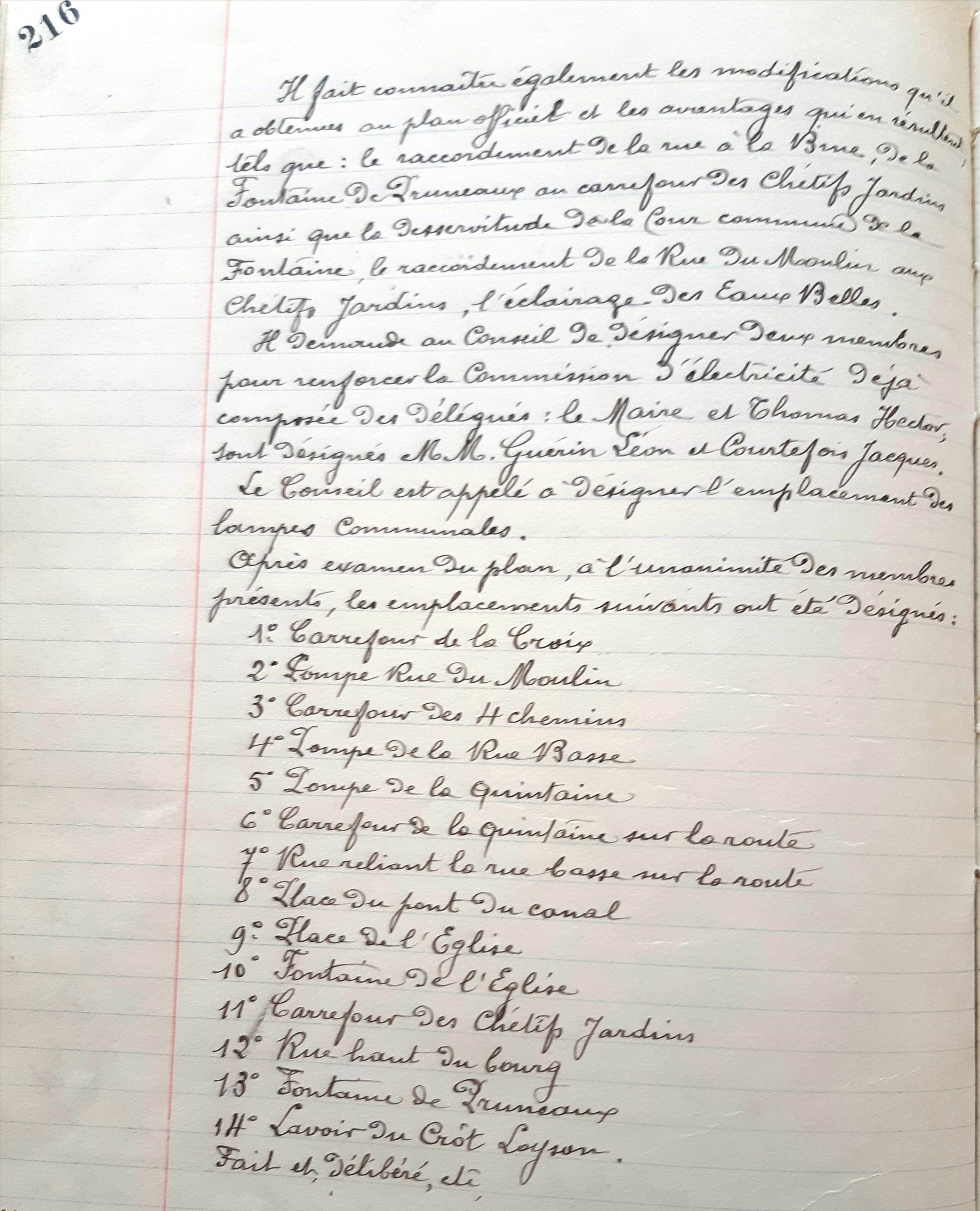 "... Mr le Maire donne au conseil les renseignements concernant l'installation de l'électricité dans la Commune. Le courant devra passer dans toutes les rues afin de desservir toutes les habitations dans le cas ou il serait impossible de passer poser un fil sur la route en raison des PTT. L'entreprise s'engage à employer tous les moyens possibles tels que rues, passages, cours pour desservir les habitations en bordure. ... Le conseil est appelé à désigner l'emplacement des lampes communales Après examen du plan, à l'unanimité des membres présents, les emplacements suivants ont été désignés 1° carrefour de la Croix, 2° pompe rue du Moulin, 3° carrefour des 4 chemins, 4° pompe de la Rue Basse, 5° pompe de la quintaine, 6° carrefour de la Quintaine sur la route, 7° rue reliant la rue basse sur la route (?) 8° place du pont du canal, 9° place de l'Eglise, 10° fontaine de l'Eglise, 11° carrefour des Chétifs Jardins, 12° rue haut du bourg, 13° fontaine de Pruneaux, 14° lavoir du Crot Loyson..." conseil municipal du 19 février 1928 |