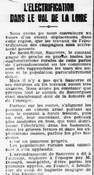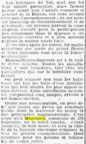 Dans le Sancerrois, donc aussi à Ménétréol, malgré les incitations du Génie Rural en faveur de l'électrification des exploitations agricoles, il faut attendre 1922 pour que l'électrification soit à l'ordre du jour,