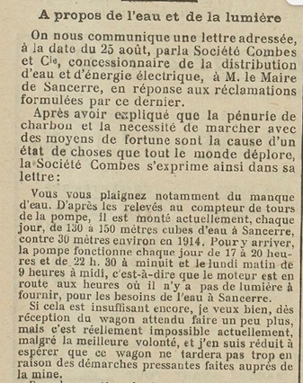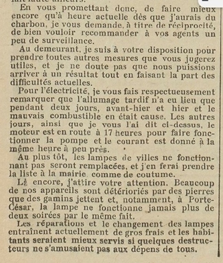 Les difficultés d'approvisionnement en charbon dans cet après guerre rend la fourniture d'eau et d'éléctricité difficile
