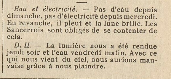 Sancerre dispose déjà en 1913 de l'eau et de l'électricité, si l'inauguration a été l'objet d'une grande fête, l'installation ne s'est faite sans quelque polémique...
