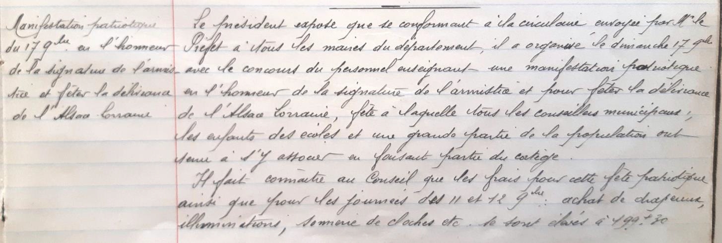 Les délibérations du Conseil municipal de Ménétréol du 24 novembre relatent les frais qui ont été engagés pour célébrer la victoire, quelques jours plus tôt, le 17 novembre.