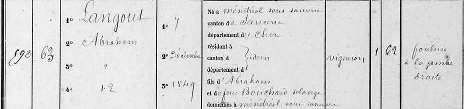 considéré comme bon lors de la visite de la classe 1869 malgré sa foulure à la jambe droite |