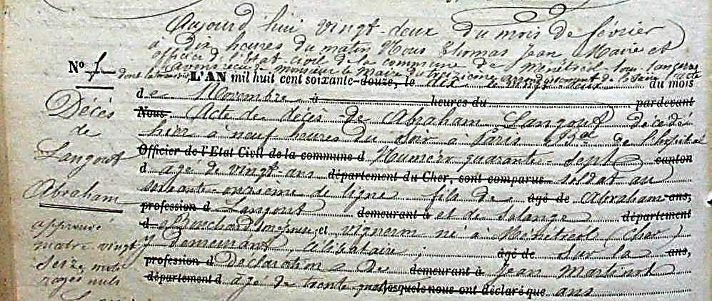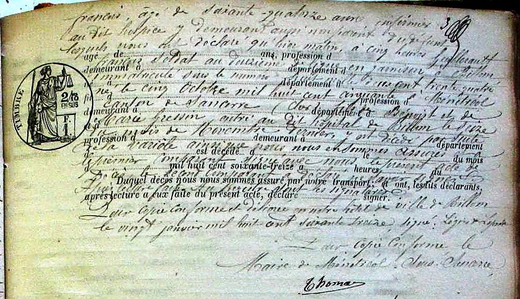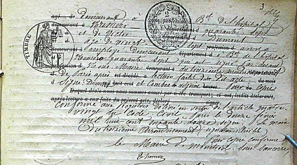 Il décède le 21 novembre 1870 au 47 Boulevard de l’hôpital Paris 13éme, son décès est transcrit le 22 février 1872 !