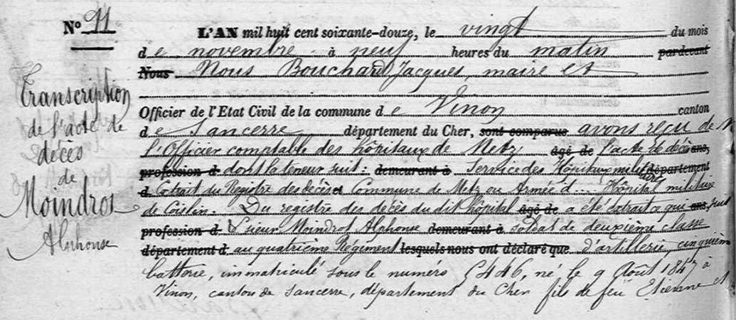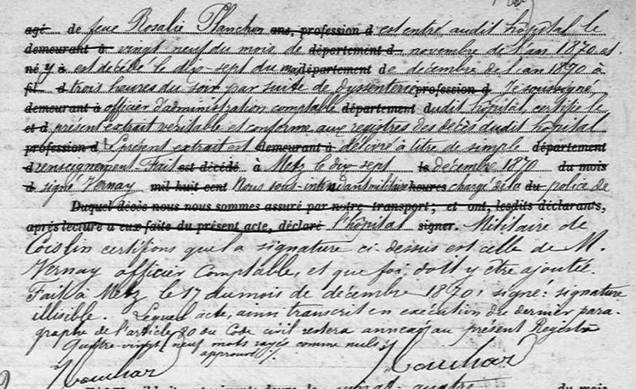Il n’a pas été possible de retrouver l’acte original sur les registres de la ville de Metz qui présente à cette époque des pages complètes de liste de soldats décédés sans beaucoup de précision…