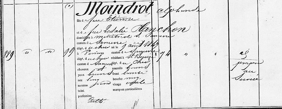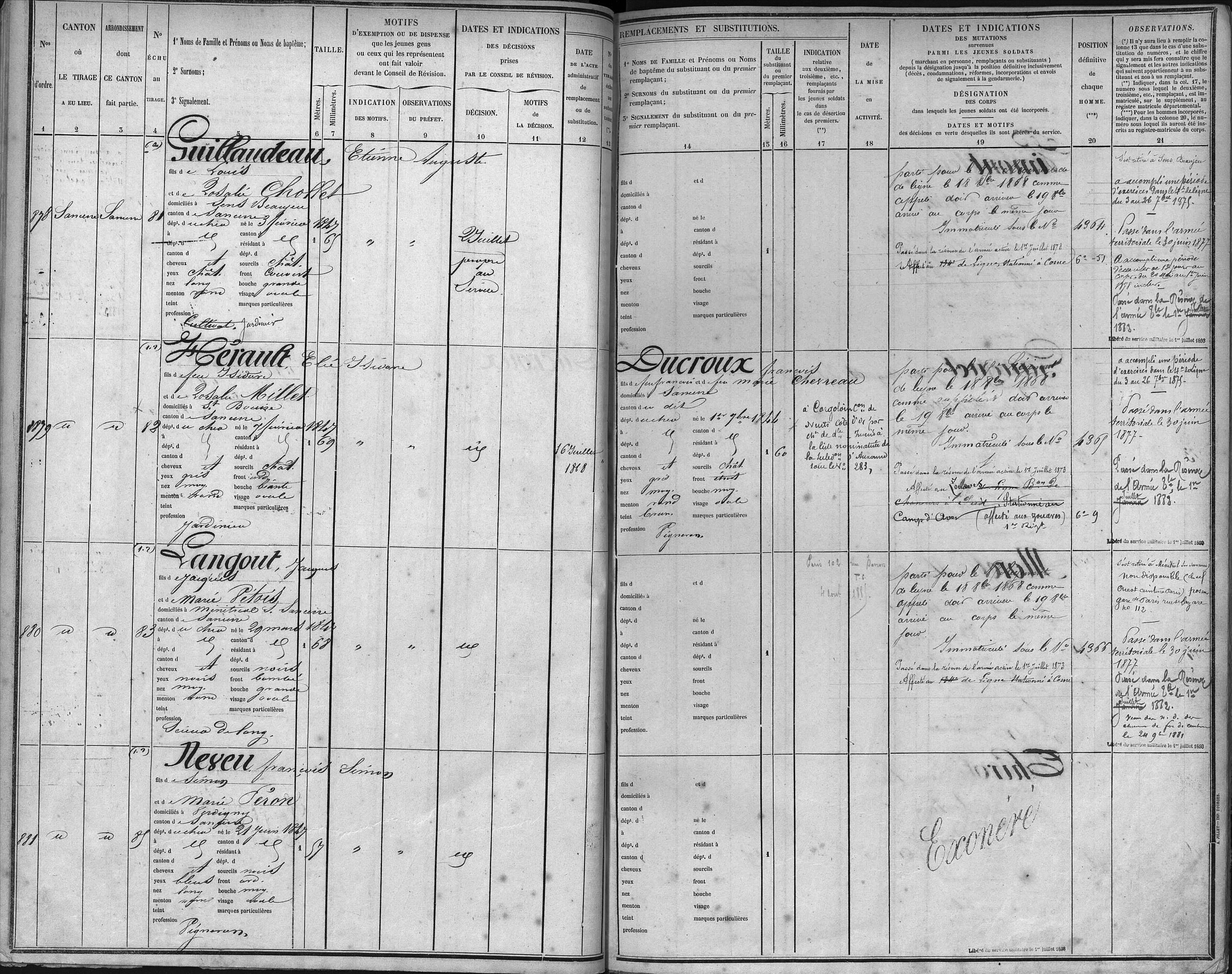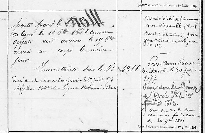 Parti pour le 87 ( ?) régiment de ligne le 18 octobre 1868 comme appelé Doit arriver au corps le 19 octobre Arrivé au corps le même jour Immatriculé sous le n° 4366 Passé dans la réserve de l’armée active le 1er juillet 1873 Affecté au ??? de ligne stationné à Cosne S’est retiré à Ménétréol sous Sancerre non disponible (…………) Passé dans l’armée territoriale le 30 juin1877 Passé dans la réserve de l’armée territoriale le 1er juillet 1882 ….............................. le 24 novembre 1881 Libéré du service militaire le 1er juillet 1893