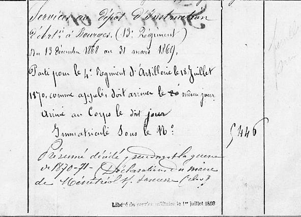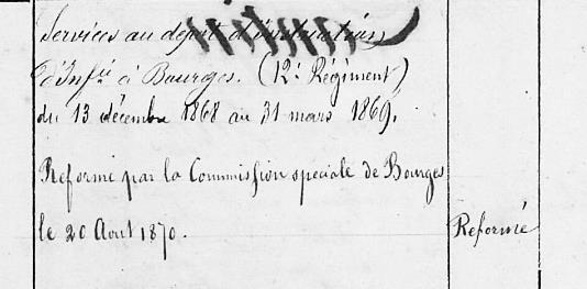 Service au dépôt d’instruction d’infanterie de Bourges (12éme régiment) du 13 décembre 1868 au 31 mars 1869 Réformé par la commission spéciale de Bourges le 20 août 1870