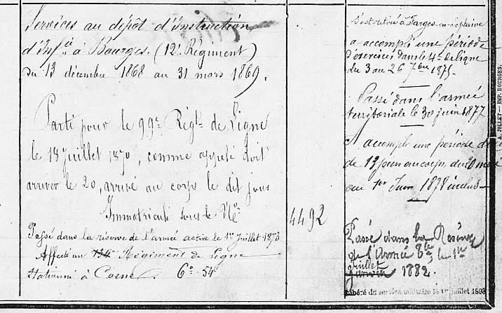 Service au dépôt d’instruction d’infanterie de Bourges (12éme régiment) du 13 décembre 1868 au 31 mars 1869 Parti pour le 99éme régiment de ligne le 19 juillet 1870, comme appelé Doit arriver au corps le dit jour Immatriculé sous le n° 4492 Passé dans la réserve de l’armée active le 1er juillet 1873 Affecté au 134éme régiment de ligne stationné à Cosne ??? S’est retiré à Farges en Septaine A accompli une période d’exercices dans le 4éme de ligne du3 au 26 septembre 1875 Passé dans l’armée territoriale le 30 juin 1877 A accompli une période de 13 jours au corps du 20 mai au 1er juin1878 inclus Passé dans la réserve de l’armée territoriale le 1er juillet 1882 Libéré du service militaire le 1er juillet 1893