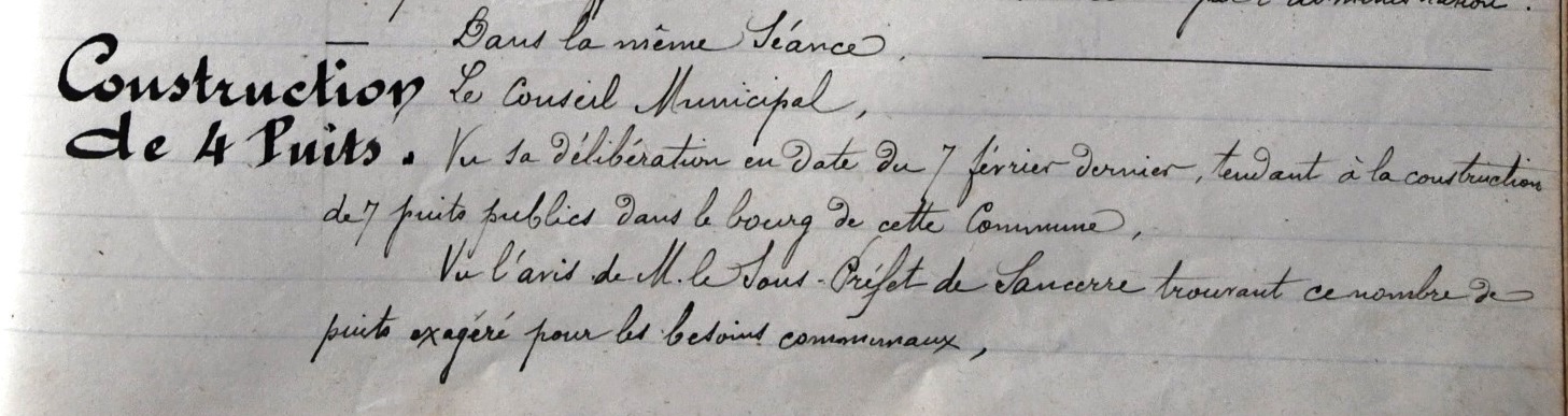 « vu les observations faites par l’administration supérieure tendant à réduire le nombre de puits votés par délibération en date du sept février dernier considérant que sept puits distribués dans l’intérieur du bourg sont nécessaires aux besoins de la population, que ce nombre n’est nullement exagéré et que l’argent pour payer est disponible... décide de s’en tenir à sa première délibération et maintient la constriction de sept puits… »