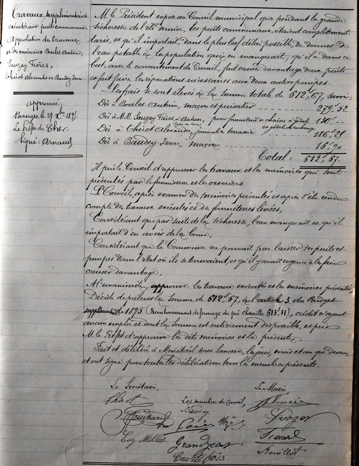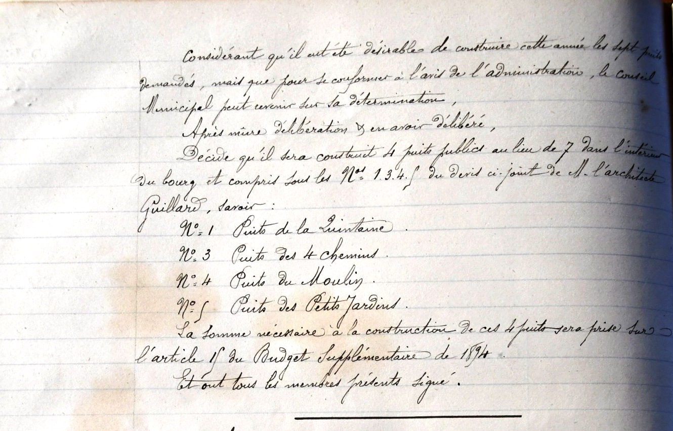 « le Conseil Municipal, Considérant que depuis longtemps la commune de Ménétréol s. Sancerre est privée de puits et qu’il est de toute nécessité qu’elle en soit pourvue, Décide après mûre délibération et à l’unanimité la construction de sept puits aux endroits indiqués sur les plans et devis de Mr l’architecte Gaillard Vote les dits plans et devis et décide que la somme de 2988 fr, somme nécessaire à cette construction sera prise sur l’article 4 du budget supplémentaire de 1893 »