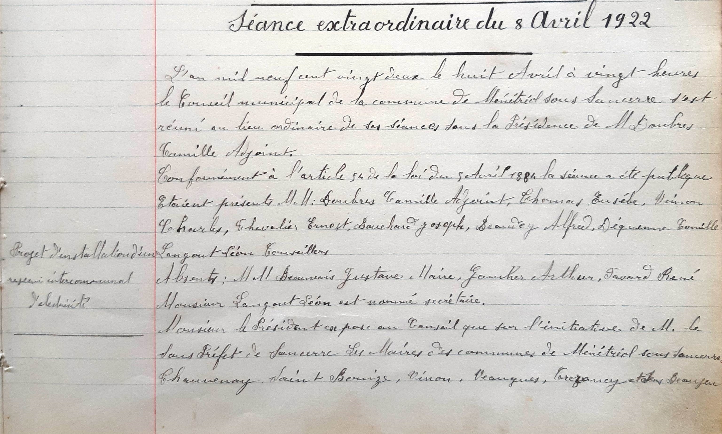 conseil municipal de Ménétréol 8 avril 1922, projet d'installation d'un réseau intercommunal d'électricité |