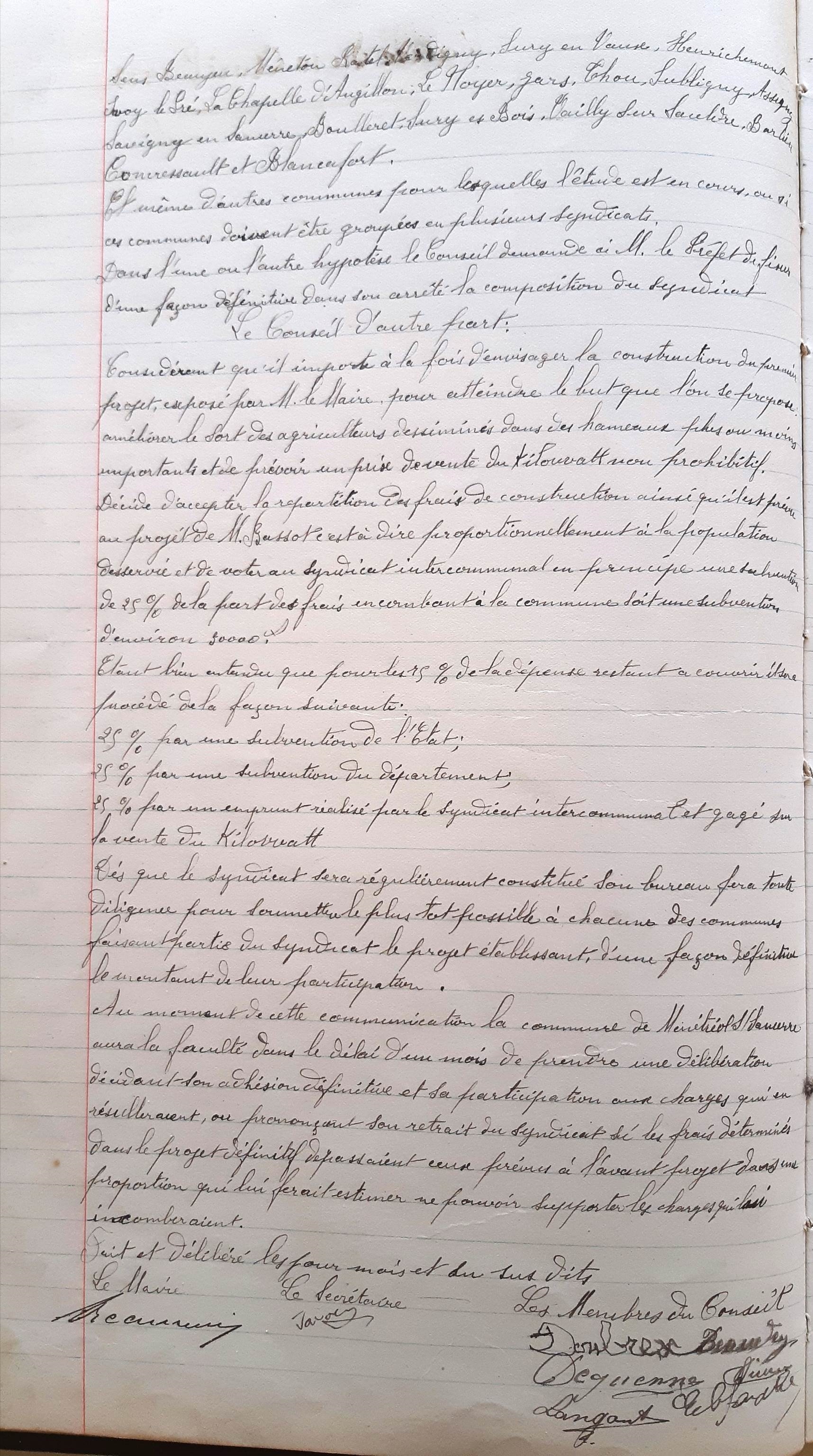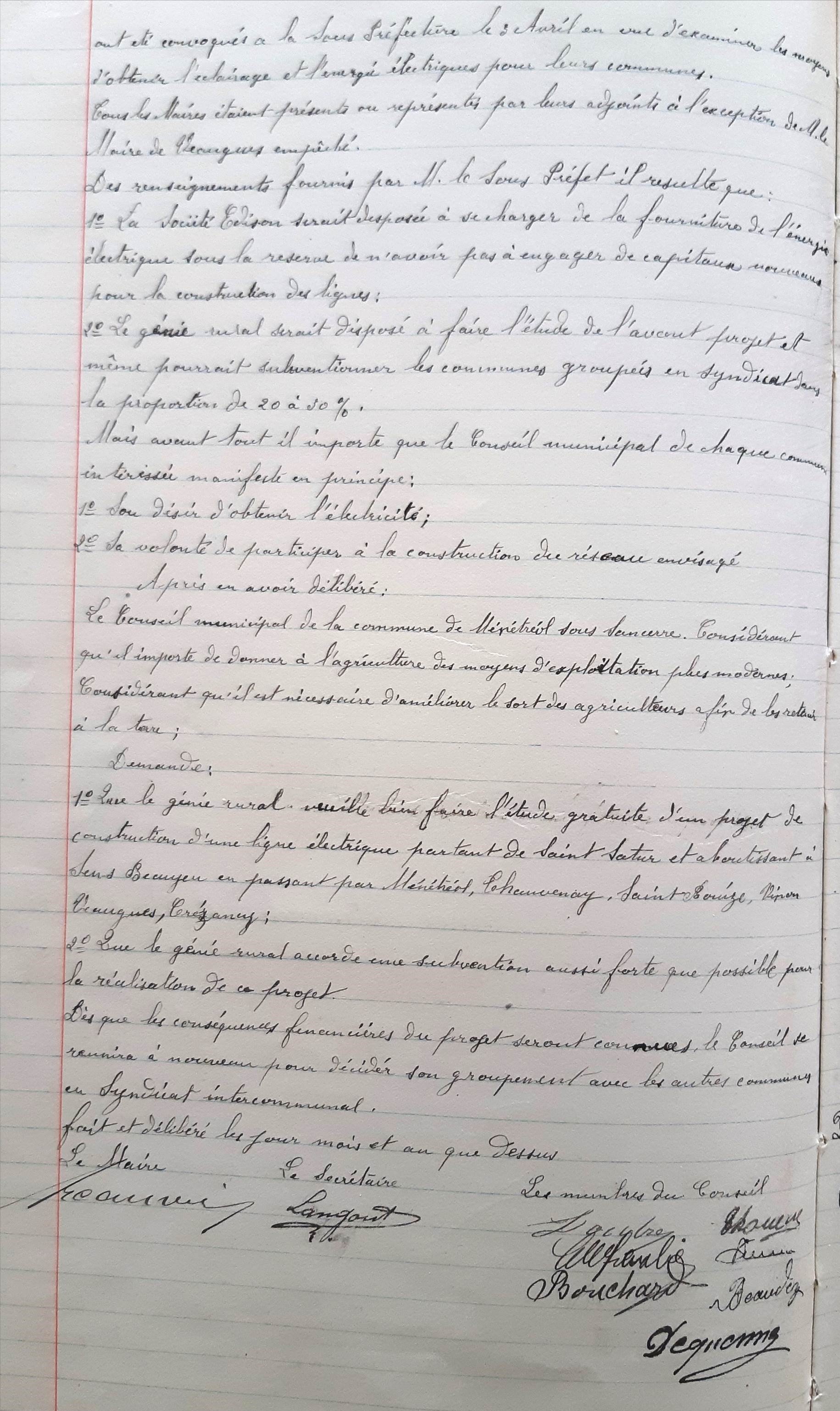 "Mr le Maire fait connaître au conseil que Mr le sous Préfet a exposé aux délégués des communes en instance d'obtenir l'électricité les grandes lignes de l'avant-projet établi par Mr Bassot, ingénieur en chef du Génie Rural. Deux projets ont été étudiés par ce chef de service pour les 44 communes au sujet desquelles l'étude a été faite. Le premier projet séleve à 6 700 000 francs nviron et le deuxième à 3 900 000 francs environ. D'après le premier projet 90.5%de la population serait desservie tandis que le deuxième projet n'en desservirait que 65% En ce qui concerne en particulier la commune de Ménétréol sous Sancerre le premier projet desservirait les points ci-après: Bourg (population totale) ..... Dans le premier projet le kilowatt devrait être vendu 2.15fr et dans le deuxième projet 2.24fr ... Dans le premier projet la dépense approximative établie d'après les bases sommaires de l'avant-projet s'élèverait pour la commune de Ménétréol sous Sancerre à 120 000fr. En présence d'une dépense aussi élevée la réalisation du projet ne semble pouvoir être possible qu'en groupant les communes intéressées en un syndicat intercommunal et n envisageant la répartition de la dépense de la façon suivante: - une subvention de la commune de Ménétréol de 25% soit 30 00fr - une subvention de l'Etat et du Département de 50% soit 60 000fr - un emprunt réalisé par le syndicat intercommunal pour les 25% restant à couvrir emprunt gagé sur la vente du kilowatt soit 30 000fr total 120 000fr. ... Le Conseil muicipal après en avoir délibéré, décide: - 1° qu'il y a lieu de constituer avec les 43 communes pour lesquelles le service du Génie Rural a étudié un projet d'électrification des campagnes en syndicat intercommunal conformement aux dispositions de la loi du 5 avril 1884 complétée par les lois du 22 mars 1890 et du 18 novembre 1917 réglementant la matière. Ce syndicat aura pour but de réaliser la construction d'un réseau électrique établi dans l'esprit de l'avant-projet dressé par Mr l'Ingénieur en chef du Génie rural et desservant environ 80 à 90% de la population..." ... conseil municipal du 2 mai 1923 |