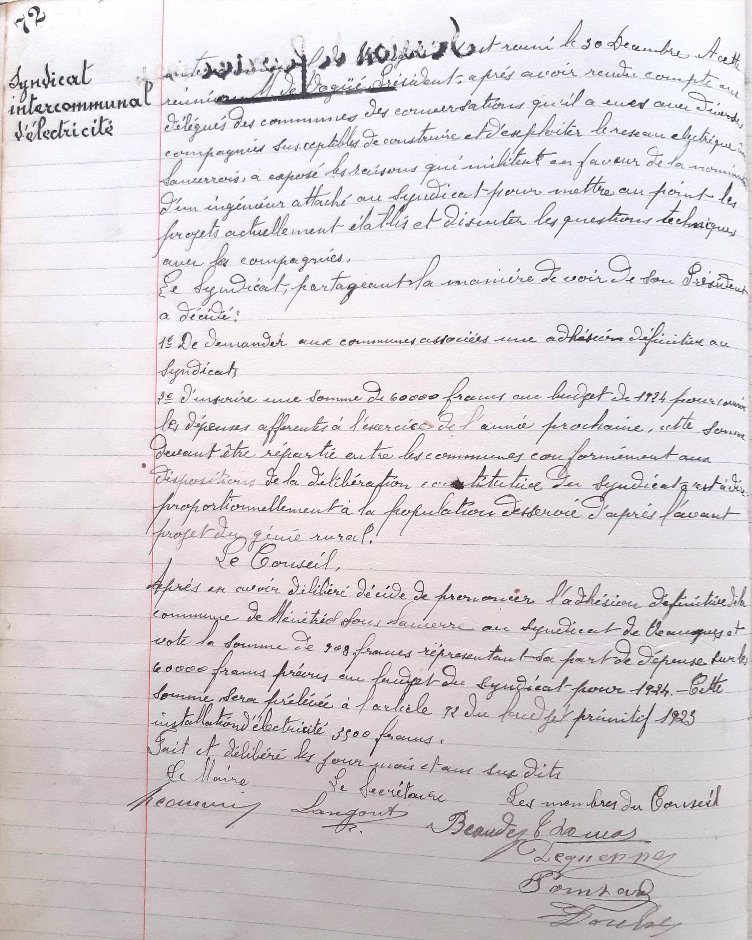 " ...Mr de Vogüé, président, après en avoir rendu compte aux délégués des communes des conversations qu'il a eu avec diverses compagnies susceptibles de construire et d'exploiter le réseau électrique Sancerrois a exposé les raisons qui militent en faveur de la nomination d'un ingénieur attaché au syndicat pour mettre au point les projets actuellement établis et discuter les questions techniques avec les compagnies, le syndicat, patageant la manière de voir de son Président a décidé: 1° de demander aux communes associées une adhésion définitive au syndicat, 2° d'inscrire ue somme de 60 000 fr au budget de 1924 pour couvrir les dépenses afférentes à l'exercice de l'année prochaine, cette somme devant être réparties entre les ommunes conformément aux dispositions de la délibération constitutive du syndicat, c'est à dire proportionnellement à la population desservie d'après l'avant-projet du Génie Rural. le Conseil, après en avoir délibéré, décide de prononcer l'adhésion définitive de la commune de Ménétréol sous Sancerre au syndicat de Veaugues..."