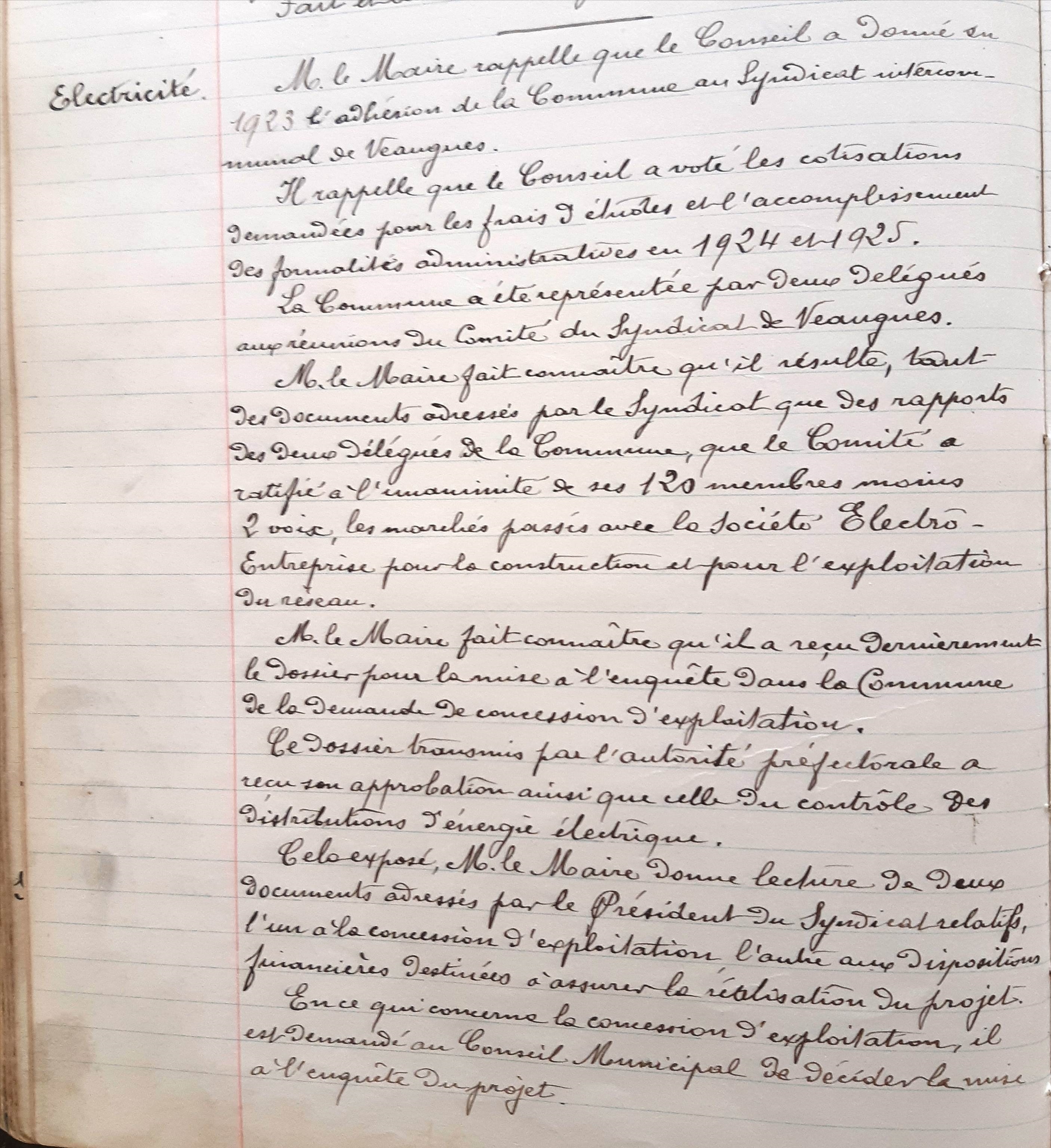 " ... Mr le Maire fait connaître qu'il résulte, tant des documents adressés par le syndicat que des rapports des deux délégués de la Commune, que le comité a ratifié à l'unanimité des ses 120 membres moins 2 voix, les marchés passés avec la société Electro-Entreprise pour la construction, et pour l'exploitation du réseau..."