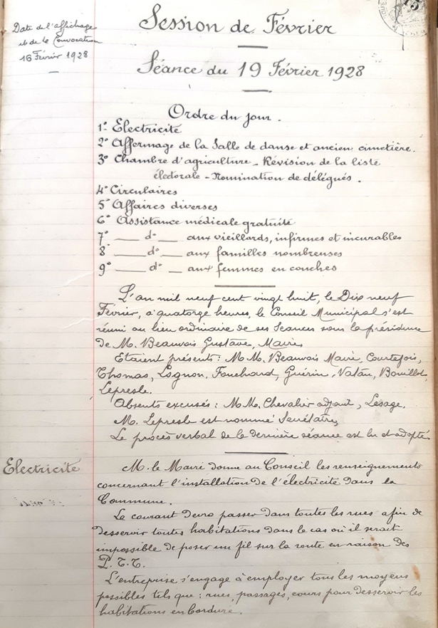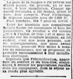 "... Mr le Maire donne au conseil les renseignements concernant l'installation de l'électricité dans la Commune. Le courant devra passer dans toutes les rues afin de desservir toutes les habitations dans le cas ou il serait impossible de passer poser un fil sur la route en raison des PTT. L'entreprise s'engage à employer tous les moyens possibles tels que rues, passages, cours pour desservir les habitations en bordure. ... Le conseil est appelé à désigner l'emplacement des lampes communales Après examen du plan, à l'unanimité des membres présents, les emplacements suivants ont été désignés 1° carrefour de la Croix, 2° pompe rue du Moulin, 3° carrefour des 4 chemins, 4° pompe de la Rue Basse, 5° pompe de la quintaine, 6° carrefour de la Quintaine sur la route, 7° rue reliant la rue basse sur la route (?) 8° place du pont du canal, 9° place de l'Eglise, 10° fontaine de l'Eglise, 11° carrefour des Chétifs Jardins, 12° rue haut du bourg, 13° fontaine de Pruneaux, 14° lavoir du Crot Loyson..." conseil municipal du 19 février 1928 |