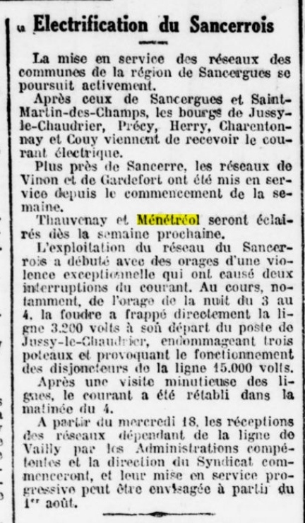 Dans le Sancerrois, donc aussi à Ménétréol, malgré les incitations du Génie Rural en faveur de l'électrification des exploitations agricoles, il faut attendre 1922 pour que l'électrification soit à l'ordre du jour,