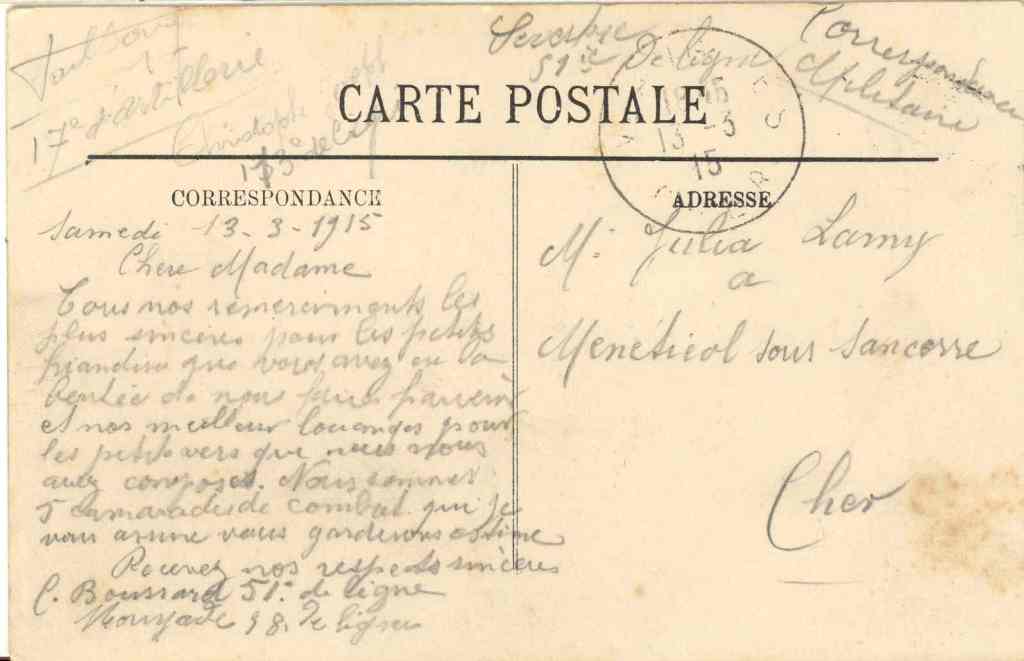 « s’estcomporté très vaillamment au combat du 25-09-1915 a assuré avec quelques hommesla défense d’une tranchée avec beaucoup de bravoure sous un feu très violent de mitrailleuses ennemies »