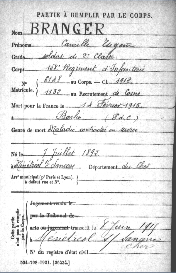 BRANGER Camille Eugène né le 7 juillet 1892 158ème régiment d'infanterie mort de maladie le 14 février 1915 à Barlin (Pas de Calais) |