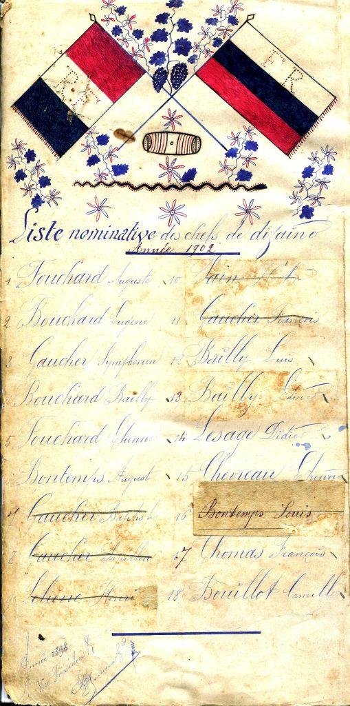Passablement malmené par les ans... il nous permet de comprendre en partie l'organisation de la Confrérie en 18 sections (dizaines) elle regroupe une grande partie des vignerons (et des sympathisants) du village, chaque section s'occupe d'une rue ou d'un quartier, elle est sous la dépendance d'un chef de section